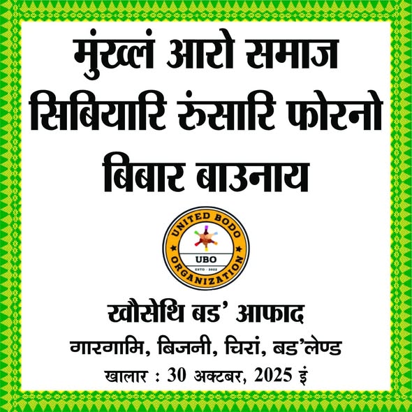 मख’जाथाव — आथिखालाव बिथां समाज सिबियारि गेदेमा– हरिहर ब्रह्मआ “खौसेथि बड’ आफाद/ UBO: United Bodo Organization”नि सासे गोख्रों बोसोनगिरि । खौसेथि बड’ आफादा बिथांनो — गोजौआव मख’जानाय बान्थाखौ मोन्नायनि सिगां, 2023 इं मायथायनि जागायनाय बोसोर समावनो– केशब नोगोरआव सानबानि हाबाफारजों गाजागोमजायै खुंफुंजानाय “1थि UBO दिन्थिफुंसालि- बिजाब मेला”नि गेजेरजों समाज सिबियारि थुलुंगानि फुंखा आरो जाफुंसार सासे न’खर दिथागिरि महरै मानबान्था होनाय जादोंमोन !